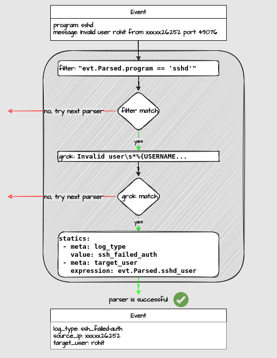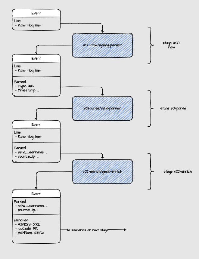 Once an event has successfully exited the parsing pipeline, it is ready to be matched against scenarios. As you might expect, each parser relies on the information that is parsed during previous stages.